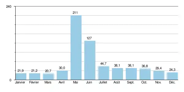 Sur la durée d'observation de 40 ans, le débit mensuel minimal a été de 16,7 m3/s en , tandis que le débit mensuel maximal s'élevait à 301 m3/s en . Des débits mensuels inférieurs à 18 m3/s sont rares.