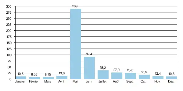 En ce qui concerne la période estivale, libre de glaces (de juin à septembre inclus), le débit mensuel minimal observé a été de 15,8 m3/s en , ce qui restait bien abondant.
