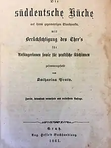 Katharina Prato, nom de plume de Katharina Pratobevera (1818–1897) est une écrivaine autrichienne de livres de cuisine. En 1858, elle publie Die süddeutsche Küche (en) qui devint extrêmement populaire pendant des décennies, atteignant une 80e édition en 1957[1],[2].