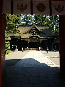 Comme c'est le cas pour l'Ise-jingū, le honden (bâtiment le plus sacré du sanctuaire) devait être détruit et reconstruit tous les vingt ans selon une pratique appelée sengū (de) (式年遷宮). Celle-ci est cependant suspendue depuis l'époque Sengoku (XVe et XVIe siècles). Le rōmon (porte du sanctuaire), qui date de 1700, est classé bien culturel important. C'est un exemple typique de l'architecture en pierre de l'époque d'Edo[1].