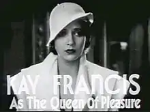 Kay Francis est une actrice américaine ( à Oklahoma City, Oklahoma - ) qui fit ses débuts à Broadway en 1925 et au cinéma en 1929 dans Noix de coco aux côtés des Marx Brothers. Elle tournera par la suite une cinquantaine de films.