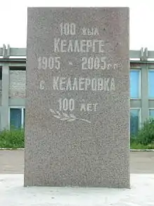À l'endroit où se trouve aujourd'hui Kellerovka, il y avait un relais de poste sur la route où les voyageurs pouvaient se reposer et changer de cheval. Mais le plus important, c'était aussi la présence d'un puits avec à côté un bosquet de bouleaux. C'est ainsi que des familles d'Allemands de Crimée se voient attribuer en 1905 la permission de cultiver ici des parcelles. Ils arrivent directement à l'automne par la gare de Petropavlovsk. Ils baptisent leur village du nom de la famille fondatrice à l'origine du projet, la famille du paysan Keller. Ils se mettent à l'ouvrage tout de suite bâtissant leur maison de terre et de rondins et cultivant la steppe. Les premières familles d'arrivants sont catholiques et s'installent le long d'une longue rue qu'ils construisent (aujourd'hui la rue Lénine). Quelques années plus tard, ils érigent sur la place du village une petite église placée sous le vocable de saint François d'Assise[1]. Plus tard, d'autres arrivants, cette fois-ci protestants venus de la Volga, s'installent le long d'une autre rue (aujourd'hui la rue Gagarine). Comme ces hommes de culte évangélique portaient de longues barbes, les catholiques les appelaient les Langharige.