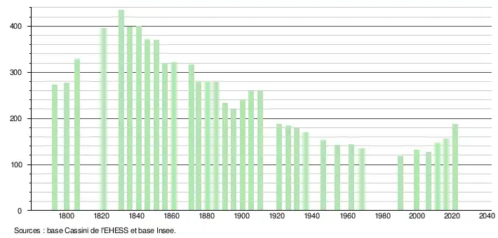 L'évolution du nombre d'habitants est connue à travers les recensements de la population effectués dans la commune depuis 1793. Pour les communes de moins de 10 000 habitants, une enquête de recensement portant sur toute la population est réalisée tous les cinq ans, les populations légales des années intermédiaires étant quant à elles estimées par interpolation ou extrapolation[19]. Pour la commune, le premier recensement exhaustif entrant dans le cadre du nouveau dispositif a été réalisé en 2006[20].