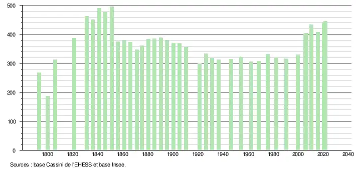 L'évolution du nombre d'habitants est connue à travers les recensements de la population effectués dans la commune depuis 1793. Pour les communes de moins de 10 000 habitants, une enquête de recensement portant sur toute la population est réalisée tous les cinq ans, les populations légales des années intermédiaires étant quant à elles estimées par interpolation ou extrapolation[17]. Pour la commune, le premier recensement exhaustif entrant dans le cadre du nouveau dispositif a été réalisé en 2005[18].