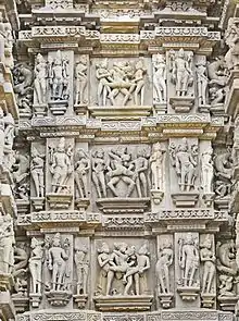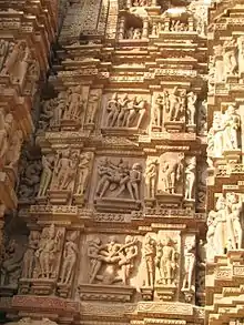 Ces temples sont célèbres pour les nombreuses scènes érotiques de couples en pleine action, accompagnés et encadrés d'ailleurs, chaque fois, par deux autres acteurs. Ces « tableaux » sont comme noyés dans un immense « bandeau » de figures gracieuses, bandeau qui couvre une grande partie des édifices, sur trois niveaux ou trois registres. Une gracieuse souplesse anime les innombrables figures qui semblent tapisser les murs, dès l'extérieur mais on les trouve aussi à l'intérieur des temples.