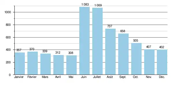 Les eaux de la rivière sont stockées dans le lac de retenue lors des crues de printemps; puis sont relâchées l'hiver suivant, dans le but de produire un maximum d'énergie lorsque l'on en a le plus besoin, en hiver. De ce fait les débits observés ne traduisent plus le rythme saisonnier naturel. Le graphique suivant a donc un but purement illustratif.