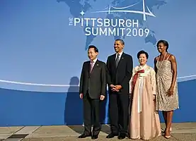 - (en) Claire Lee, « First lady hosts dinner for leaders’ spouses », sur The Korea Herald, (consulté le )