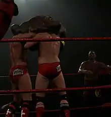 - Royal Bomb (Double straight jacket sitout powerbomb pin)[3]