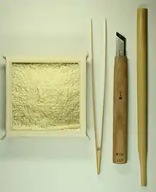 La feuille collée est ensuite coupée avec un couteau en bambou sur une table recouverte de peau de cerf. Elle est alors apposée avec de la colle (colle d'algue, colle funori et peau, nikawa) sur l'objet à décorer.