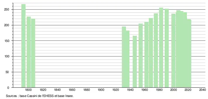 L'évolution du nombre d'habitants est connue à travers les recensements de la population effectués dans la commune depuis 1793. Pour les communes de moins de 10 000 habitants, une enquête de recensement portant sur toute la population est réalisée tous les cinq ans, les populations légales des années intermédiaires étant quant à elles estimées par interpolation ou extrapolation[19]. Pour la commune, le premier recensement exhaustif entrant dans le cadre du nouveau dispositif a été réalisé en 2005[20].