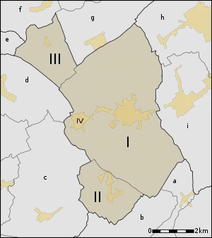 Koekelare, communes fusionnées et voisines. Les zones en jaune sont les surfaces bâties.