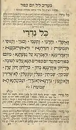 « Tous les vœux que nous pourrions faire depuis ce jour de Kippour jusqu'à celui de l'année prochaine (qu'il nous soit propice), toute interdiction ou sentence d'anathème que nous prononcerions contre nous-mêmes, toute privation ou renonciation que, par simple parole, par vœu ou par serment nous pourrions nous imposer, nous les rétractons d'avance ; qu'ils soient tous déclarés non valides, annulés, dissous, nuls et non avenus ; qu'ils n'aient ni force ni valeur ; que nos vœux ne soient pas regardés comme vœux, ni nos serments comme serments[1]. »