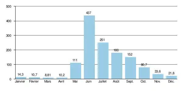 Le débit moyen mensuel observé en mars (minimum d'étiage) est de 8,81 m3/s, soit plus ou moins 2 % du débit moyen du mois de juin (437 m3/s), ce qui souligne l'amplitude extrêmement élevée des variations saisonnières. Sur la durée d'observation de 36 ans, le débit mensuel minimal a été de 3,85 m3/s en , tandis que le débit mensuel maximal s'élevait à 667 m3/s en .