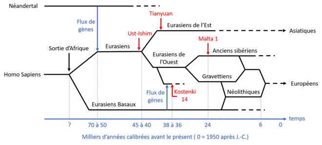- il est plus près des européens que des asiatiques[7]; donc il y a au minimum 36000 ans le tronc commun eurasien a déjà éclaté en deux sous-groupes : européen-sibérien d'une part (Eurasien de l'Ouest dans la publication), et asiatique d'autre part (Eurasien de l'Est). Combiné avec les résultats concernant l'Homme de Ust-Ishim en Sibérie occidentale, daté de 45000 ans AP et qui appartient au tronc commun eurasien, on estime donc la séparation des européens-sibériens avec les asiatiques entre 45000 ans et 36 000 ans calibrés AP. De plus, l'Homme de Tianyuan en Chine, qui appartient à la lignée asiatique, est daté de 42000 à 39000 ans calibrés AP. Ceci restreint la fourchette de séparation entre 45000 ans et 40000 ans. En fait, l'Homme de Ust-Ishim est peut-être contemporain de la séparation des premiers eurasiens en deux grandes lignées, celle de Kostenki 14 vers l'Ouest (et la Sibérie) et celle de l'Homme de Tianyuan vers l'Est (Chine).