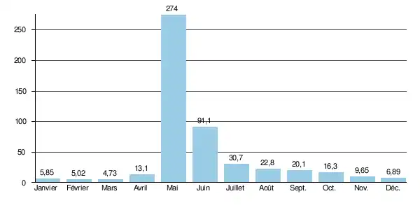 Le débit moyen mensuel observé en mars (minimum d'étiage) est de 4,73 m3/s, soit moins de 2 % du débit moyen du mois de mai (274 m3/s), maximum de l'année, ce qui souligne l'amplitude très importante des variations saisonnières. Sur la durée d'observation de 19 ans, le débit mensuel minimal a été de 1,81 m3/s (), tandis que le débit mensuel maximal s'élevait à 433 m3/s ().