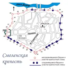 - Смоленская крепостная стена: история строительства, информация о башнях, фотогалерея Les murs de la forteresse de Smolensk (ru)