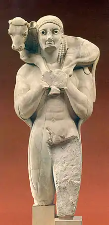 - (Musée de l'Acropole, Athènes) Moscophore, époque archaïques, vers 570 avant notre ère, acc. non. 624