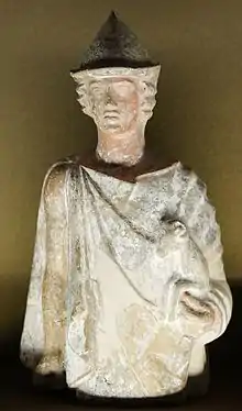 - (Cleveland Museum of Art) Guerrier kriophoros, figurine en terre cuite peinte, époque archaïque, Crète, VIIe siècle a.v. J.-C. terracotta peinte archaïque en terre cuite peint kriophoros, Crète, VIIe siècle avant notre ère