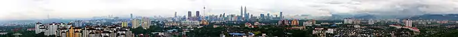 Kuala Lumpur est située dans le sud-ouest de la Malaisie. Elle s'est développée initialement dans la vallée du Klang et son centre se trouve au confluent de cette rivière avec le Gombak à 45 km de la mer. Cette vallée est bordée à l'est par les Monts Titiwangsa, au nord et au sud par des reliefs modérés[18]. Le terrain relativement plein (altitude moyenne de 81,95 mètres)[19] et la situation dans l'état le plus développé de la Malaisie a favorisé la croissance rapide de l'agglomération au cours des dernières décennies[20]. Celle-ci déborde largement les limites du territoire fédéral en englobant une bonne partie de l'État du Selangor. L'expansion a suivi les autoroutes et les lignes de transport en commun lourd dont le métro léger. L'aire urbaine s'étend à l'ouest jusqu'au port de Kelang, qui donne sur le détroit de Malacca.