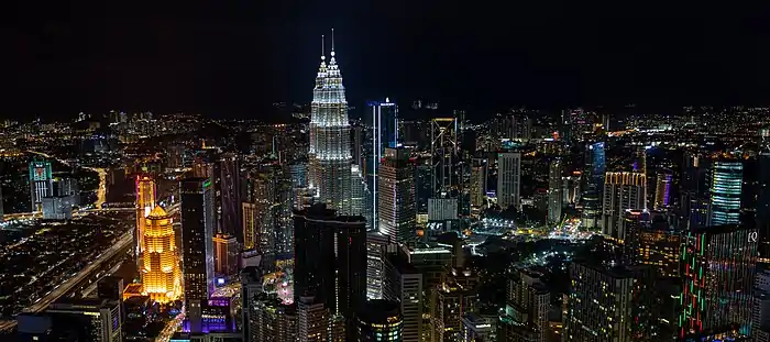 La ville compte plus de 200 gratte-ciel dont les tours Petronas, deux gratte-ciel inaugurés en 1998, symboles du développement récent de l'ensemble du pays. Leur architecture fait intervenir différents symboles des composantes de la population nationale : les aspects malais, islamique, mais aussi chinois[42]. Avec une hauteur de 452 m et 88 étages, elles étaient jusqu'en 2004 les plus hautes tours du monde.