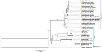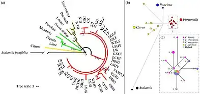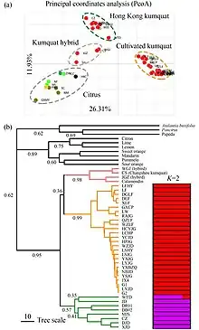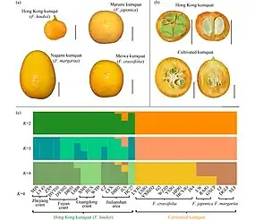 L'analyse de locus des chloroplastes et des microsatellites nucléaires permettent de reconstituer (2022) une phylogénie indépendante de Fortunella dans le groupe des agrumes, et de diviser le genre en 2 populations: les kumquats cultivés Fortunella spp. (F. marguerita , F. crassifolia et F. japonica ); et le kumquat sauvage de Hong-Kong ( Fortunella hindsii ). Les premiers ont une diversité génomique faible qui résulterait d'une sélection anthropique[11]. Fortunella est plus proche de Citrus que de Poncirus et le calamondin, le kumquat Changshou (F. obovata = Citrus obovata), les Wenguangju ornementaux et porte-greffe sont des hybrides avec parent femelle Fortunella .