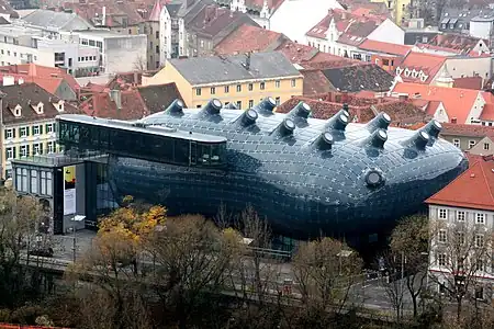 La forme surprenante et épurée du bâtiment qui diffère radicalement de la typologie habituelle des lieux d'exposition, la plupart du temps fidèle à la tradition moderniste du « cube blanc ». L'équipe d'architectes a choisi une expression architecturale innovante dans la mouvance de ce qu'on appelle la blob architecture qu'ils plongent dans un contexte architectural du XIXe siècle des faubourgs de la Mur. Ce grand bâtiment appelé Friendly Alien (gentil extraterrestre) par ses auteurs, Peter Cook (ex d'Archigram) et Colin Fournier (en), contraste volontairement par sa forme et ses matériaux avec le paysage de toits baroques alentour, avec leur tuiles en argile rouge, mais cependant il conserve une façade en fonte de 1847 du bâtiment d'origine.