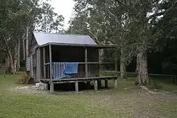 "Kylie's Hut", la hutte où l'auteur a passé sa retraite à Crowdy Bay et qui a été détruite pendant les feux de brousse australiens 2019-2020[23].