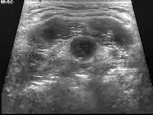 L’échographie est l’examen de choix car facile d’accès, peu coûteux et non irradiant (en particulier chez l’enfant). Elle retrouve une masse arrondie, anéchogène, aux parois lisses. Elle vérifie également la bonne position de la thyroïde.