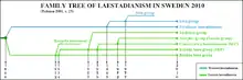 Les Laestadiens de Finlande font partie de l'Église évangélique-luthérienne de Finlande, mais en Amérique, où il n'y a pas d'église officielle luthérienne, ils ont fondé des dénominations propres qui se sont divisées en plusieurs sous- groupes au milieu du XXe siècle. En raison de différences doctrinales et de conflits de personnes, le mouvement a été divisé en 19 branches, dont 15 sont en activité aujourd'hui. Les trois branches principales sont :