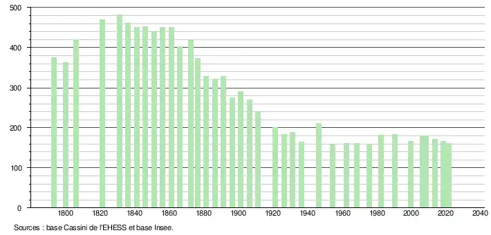 L'évolution du nombre d'habitants est connue à travers les recensements de la population effectués dans la commune depuis 1793. Pour les communes de moins de 10 000 habitants, une enquête de recensement portant sur toute la population est réalisée tous les cinq ans, les populations légales des années intermédiaires étant quant à elles estimées par interpolation ou extrapolation[19]. Pour la commune, le premier recensement exhaustif entrant dans le cadre du nouveau dispositif a été réalisé en 2008[20].