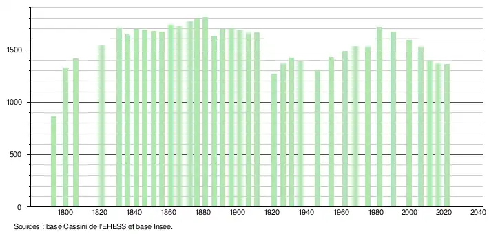L'évolution du nombre d'habitants est connue à travers les recensements de la population effectués dans la commune depuis 1793. Pour les communes de moins de 10 000 habitants, une enquête de recensement portant sur toute la population est réalisée tous les cinq ans, les populations légales des années intermédiaires étant quant à elles estimées par interpolation ou extrapolation[24]. Pour la commune, le premier recensement exhaustif entrant dans le cadre du nouveau dispositif a été réalisé en 2006[25].