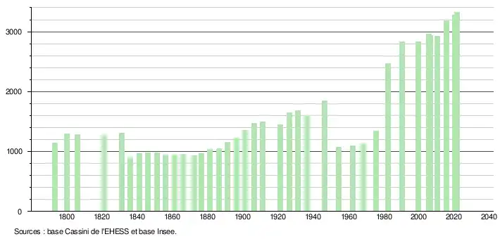 L'évolution du nombre d'habitants est connue à travers les recensements de la population effectués dans la commune depuis 1793. Pour les communes de moins de 10 000 habitants, une enquête de recensement portant sur toute la population est réalisée tous les cinq ans, les populations légales des années intermédiaires étant quant à elles estimées par interpolation ou extrapolation[29]. Pour la commune, le premier recensement exhaustif entrant dans le cadre du nouveau dispositif a été réalisé en 2005[30].