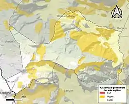 Le retrait-gonflement des sols argileux est susceptible d'engendrer des dommages importants aux bâtiments en cas d’alternance de périodes de sécheresse et de pluie[45]. 31,5 % de la superficie communale est en aléa moyen ou fort (59 % au niveau départemental et 48,5 % au niveau national)[Carte 7]. Depuis le , en application de la loi ELAN, différentes contraintes s'imposent aux vendeurs, maîtres d'ouvrages ou constructeurs de biens situés dans une zone classée en aléa moyen ou fort[Note 8],[46].