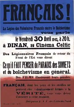 La Légion des volontaires français contre le bolchévisme, dite Légion des volontaires français (LVF), ou « Infanterie Regiment 638[1] » en allemand pour sa partie combattant au sein de la Wehrmacht, est une organisation créée le , soit quinze jours après le déclenchement de l'invasion de l'URSS par l'Allemagne[2]. Cette légion est soutenue par des partis collaborationnistes français, notamment le Rassemblement national populaire (RNP) de Marcel Déat, le Parti populaire français (PPF) de Jacques Doriot et le Mouvement social révolutionnaire (MSR) d'Eugène Deloncle.