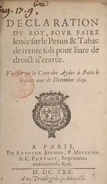Le tabac a été l'objet d'une législation fiscale depuis Louis XIII. Dans une déclaration royale de 1629, il fixe à trente sol la livre le droit d'entrée du tabac sur le territoire du royaume[2], exception faite à la compagnie dressée par le cardinal de Richelieu qui en est exemptée[3].