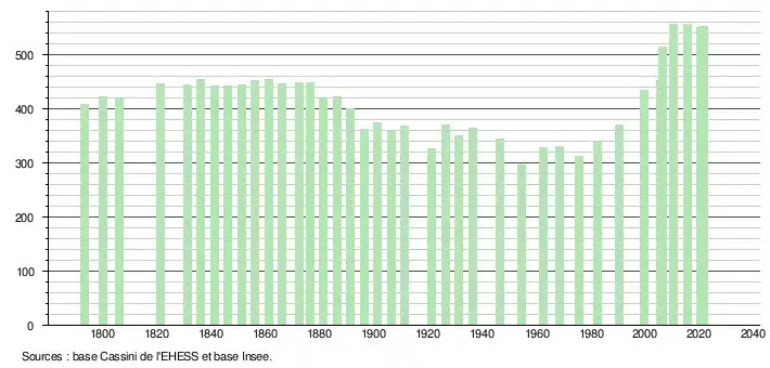L'évolution du nombre d'habitants est connue à travers les recensements de la population effectués dans la commune depuis 1793. Pour les communes de moins de 10 000 habitants, une enquête de recensement portant sur toute la population est réalisée tous les cinq ans, les populations légales des années intermédiaires étant quant à elles estimées par interpolation ou extrapolation[25]. Pour la commune, le premier recensement exhaustif entrant dans le cadre du nouveau dispositif a été réalisé en 2005[26].