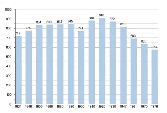 Les chiffres des années 1831 à 1970 tiennent compte des chiffres des anciennes communes fusionnées.