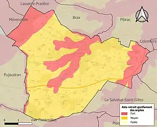 Le retrait-gonflement des sols argileux est susceptible d'engendrer des dommages importants aux bâtiments en cas d’alternance de périodes de sécheresse et de pluie. La totalité de la commune est en aléa moyen ou fort (88,8 % au niveau départemental et 48,5 % au niveau national). Sur les 2 712 bâtiments dénombrés sur la commune en 2019, 2 712 sont en aléa moyen ou fort, soit 100 %, à comparer aux 98 % au niveau départemental et 54 % au niveau national. Une cartographie de l'exposition du territoire national au retrait gonflement des sols argileux est disponible sur le site du BRGM[28],[Carte 2].