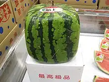 On peut aussi provoquer l'apparition de formes inhabituelles de légumes. Au Japon, des agriculteurs de la région de Zentsuji ont réussi à produire des pastèques cubiques. Cette forme est censée permettre de superposer et de stocker plus facilement ces pastèques, mais leur prix est souvent plus de double de celui des pastèques normales[2]. Usant de techniques similaires, des producteurs ont aussi créé des pastèques de forme plus complexe, comme des dés, des pyramides, des visages[3]...