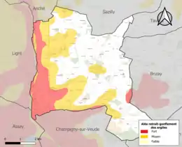 Le retrait-gonflement des sols argileux est susceptible d'engendrer des dommages importants aux bâtiments en cas d’alternance de périodes de sécheresse et de pluie. 41,6 % de la superficie communale est en aléa moyen ou fort (90,2 % au niveau départemental et 48,5 % au niveau national). Sur les 237 bâtiments dénombrés sur la commune en 2019, 149 sont en aléa moyen ou fort, soit 63 %, à comparer aux 91 % au niveau départemental et 54 % au niveau national. Une cartographie de l'exposition du territoire national au retrait gonflement des sols argileux est disponible sur le site du BRGM[24],[25].