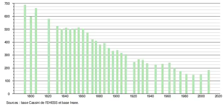 - Dans le tableau des recensements et le graphique, par convention dans Wikipédia, le principe a été retenu, pour les populations légales postérieures à 1999 de n’afficher dans le tableau des recensements et le graphique que les populations correspondant à l'année 2006, première population légale publiée calculée conformément aux concepts définis dans le décret no 2003-485 du 5 juin 2003, et les années correspondant à une enquête exhaustive de recensement pour les communes de moins de 10 000 habitants, ainsi que la dernière population légale publiée par l’Insee.