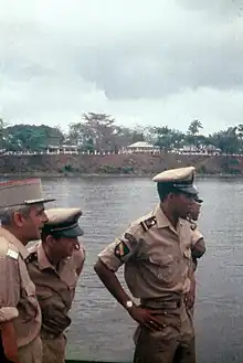 « règne de terreur » qui avait débuté vers le 23 septembre continue sans diminuer. Des signes de troubles sont évidents et le peuple manifeste son mécontentement devant les mesures répressives de Mba. Hier, un groupe de prisonniers politiques a été promené nu à travers la ville et publiquement battu avec des clubs de golf et des crosses de fusils. À la session d’ouverture de l’Assemblée, deux députés ont été arrêtés et la police en recherche un troisième[80]. »