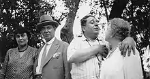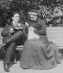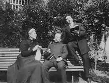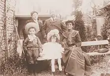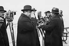 | Aux Studios Franco-Films de Nice-Saint-Augustin. Photographie représentant Léonce Perret expliquant une particularité du décor de Quand nous étions deux au journaliste Edmond Épardaud accompagné de sa femme Madeleine, en présence de René Isnardon, directeur des studios, publiée par la revue Cinéma en juillet 1929[6]. | |