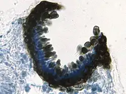 - L'espèce a été publiée comme champignon, mais s'est entre-temps avérée être un lichen à part entière. Cf. Diederich, P. & C. Scheidegger, 1996. Reichlingia leopoldii gen. et sp. nov., a new lichenicolous hyphomycete from Central Europe. « Bulletin de la Société des naturalistes luxembourgeois 97: 3-8 »(Archive.org • Wikiwix • Archive.is • Google • Que faire ?).