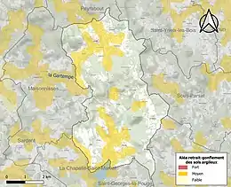 Le retrait-gonflement des sols argileux est susceptible d'engendrer des dommages importants aux bâtiments en cas d’alternance de périodes de sécheresse et de pluie. 26,8 % de la superficie communale est en aléa moyen ou fort (33,6 % au niveau départemental et 48,5 % au niveau national). Sur les 189 bâtiments dénombrés sur la commune en 2019, 30 sont en aléa moyen ou fort, soit 16 %, à comparer aux 25 % au niveau départemental et 54 % au niveau national. Une cartographie de l'exposition du territoire national au retrait gonflement des sols argileux est disponible sur le site du BRGM[17],[Carte 2].