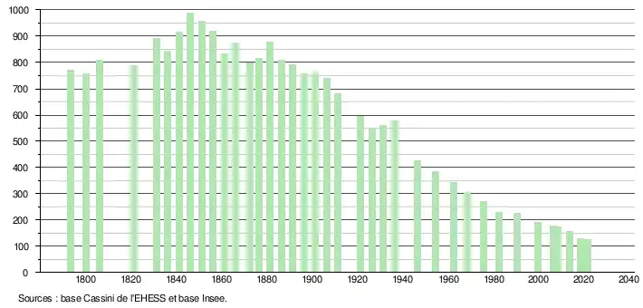 L'évolution du nombre d'habitants est connue à travers les recensements de la population effectués dans la commune depuis 1793. Pour les communes de moins de 10 000 habitants, une enquête de recensement portant sur toute la population est réalisée tous les cinq ans, les populations légales des années intermédiaires étant quant à elles estimées par interpolation ou extrapolation[21]. Pour la commune, le premier recensement exhaustif entrant dans le cadre du nouveau dispositif a été réalisé en 2008[22].