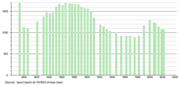 L'évolution du nombre d'habitants est connue à travers les recensements de la population effectués dans la commune depuis 1793. Pour les communes de moins de 10 000 habitants, une enquête de recensement portant sur toute la population est réalisée tous les cinq ans, les populations légales des années intermédiaires étant quant à elles estimées par interpolation ou extrapolation[27]. Pour la commune, le premier recensement exhaustif entrant dans le cadre du nouveau dispositif a été réalisé en 2008[28].