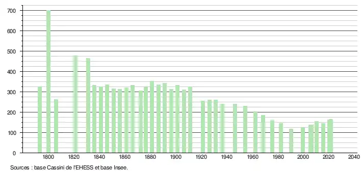 L'évolution du nombre d'habitants est connue à travers les recensements de la population effectués dans la commune depuis 1793. Pour les communes de moins de 10 000 habitants, une enquête de recensement portant sur toute la population est réalisée tous les cinq ans, les populations légales des années intermédiaires étant quant à elles estimées par interpolation ou extrapolation[19]. Pour la commune, le premier recensement exhaustif entrant dans le cadre du nouveau dispositif a été réalisé en 2005[20].