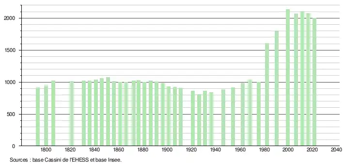 L'évolution du nombre d'habitants est connue à travers les recensements de la population effectués dans la commune depuis 1793. Pour les communes de moins de 10 000 habitants, une enquête de recensement portant sur toute la population est réalisée tous les cinq ans, les populations légales des années intermédiaires étant quant à elles estimées par interpolation ou extrapolation[19]. Pour la commune, le premier recensement exhaustif entrant dans le cadre du nouveau dispositif a été réalisé en 2006[20].