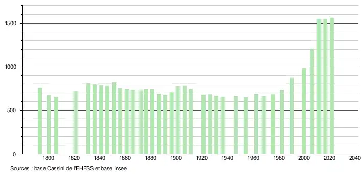L'évolution du nombre d'habitants est connue à travers les recensements de la population effectués dans la commune depuis 1793. Pour les communes de moins de 10 000 habitants, une enquête de recensement portant sur toute la population est réalisée tous les cinq ans, les populations légales des années intermédiaires étant quant à elles estimées par interpolation ou extrapolation[22]. Pour la commune, le premier recensement exhaustif entrant dans le cadre du nouveau dispositif a été réalisé en 2006[23].